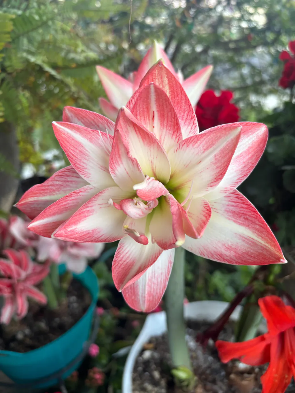 Amaryllis Blossom Peacock is a starry red and white wonder. An absolutely gorgeous fully double flowering amaryllis, this is the perfect centerpiece for holiday decor. Pointed white petals are brushed with pink-red streaks along the edges. Quite a festive treat for your eyes!