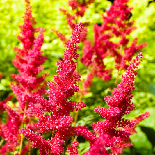 With common names like False Spirea, False Goat's Beard and Feather Flower, Astilbe are shade loving perennials with fluffy, feathery plumes that are highly attractive to butterflies, but very resistant to deer and rodents. Astilbe are lovely planted with Hosta and Dicentra.