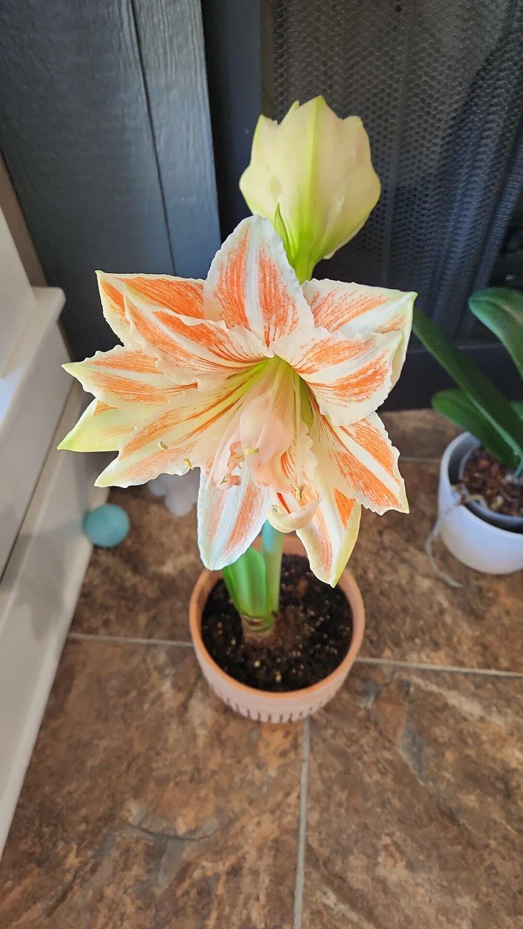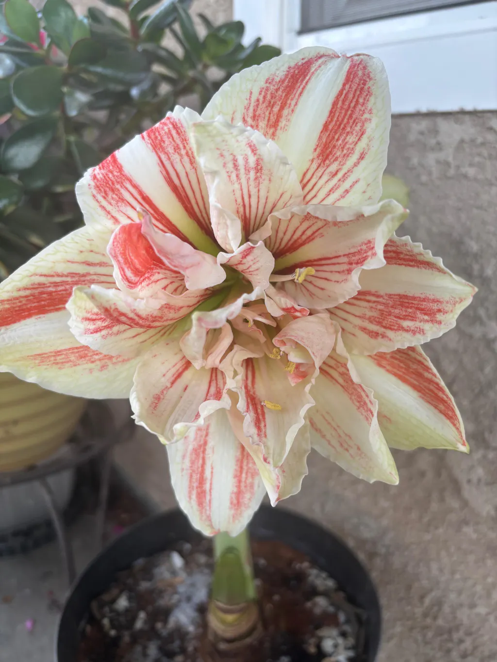 Amaryllis Dancing Queen is absolutely fabulous. Her gigantic, over the top, bright white, fully double flowers are striped with vivid Salmon streaks. The ruffled blooms will prance and dance their way into your list of holiday favorites. She’s a true queen of the Amaryllis, with every bulb producing multiple enormous flowers per stem.
