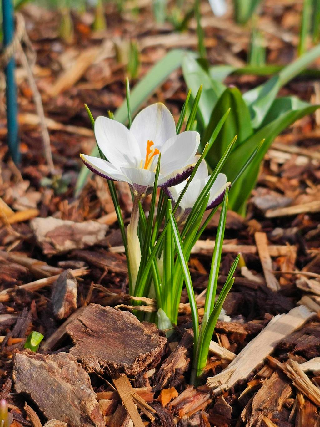Crocus Chrysanthus Prins Claus presents large, calyx-shaped, white flowers delicately adorned with deep purple blotches, prominent orange anthers, and a vibrant golden heart. The gleaming blossoms create a phenomenal display when planted en masse or when paired with clusters of bright yellow Goldilocks.