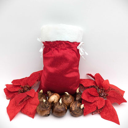 Gift includes: 10 Paperwhite bulbs in a Santa stocking velvet gift bag.
