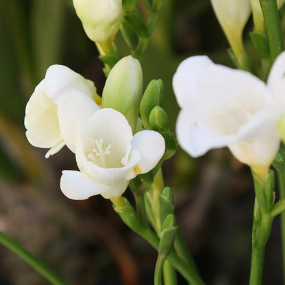 The delicate, fragrant, single white blooms dance atop sturdy, arching bright green stems. Freesias make excellent cut flowers and do well when planted in the fall outside in zones 9 and above. Plant in containers or as annuals in the spring in cooler regions.