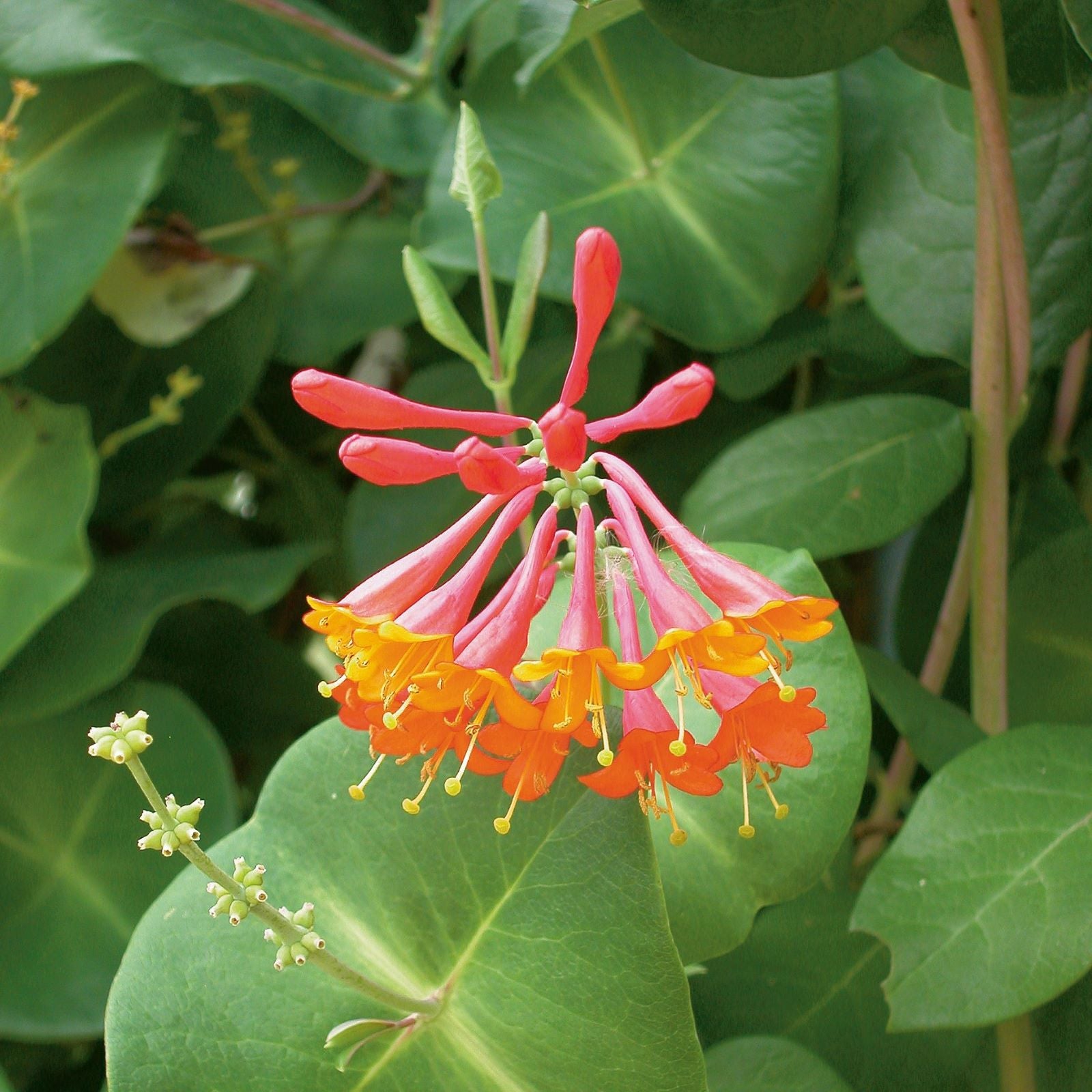 Dropmore Scarlet has a reputation as being the most popular, and to many, most beautiful of all Honeysuckle vines in America. Between its fast-growing, long-blooming nature and spectacular fuchsia-like blossoms, we can't argue! Each sweetly scented, trumpet-shaped flower emerges with a dramatic orange throat and is backed by handsome green foliage.
