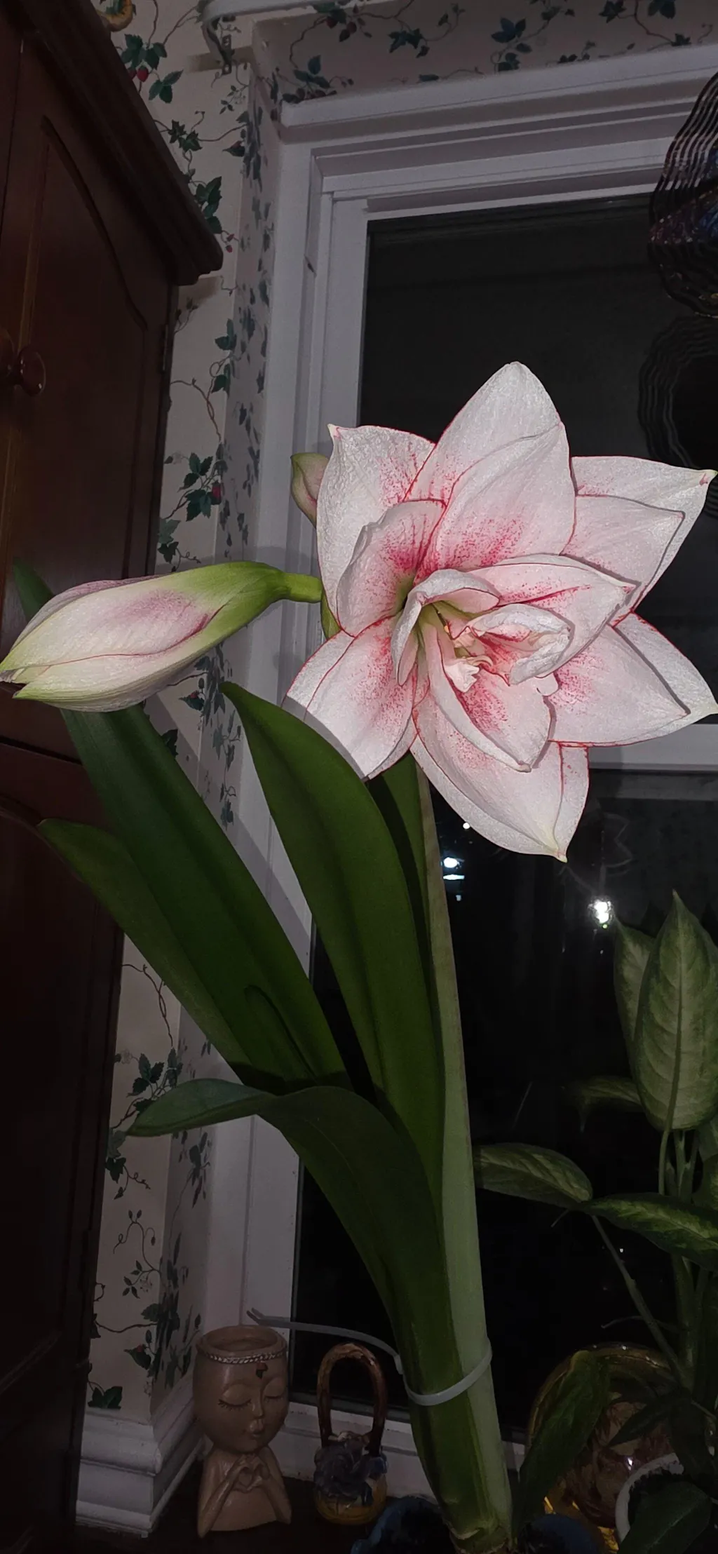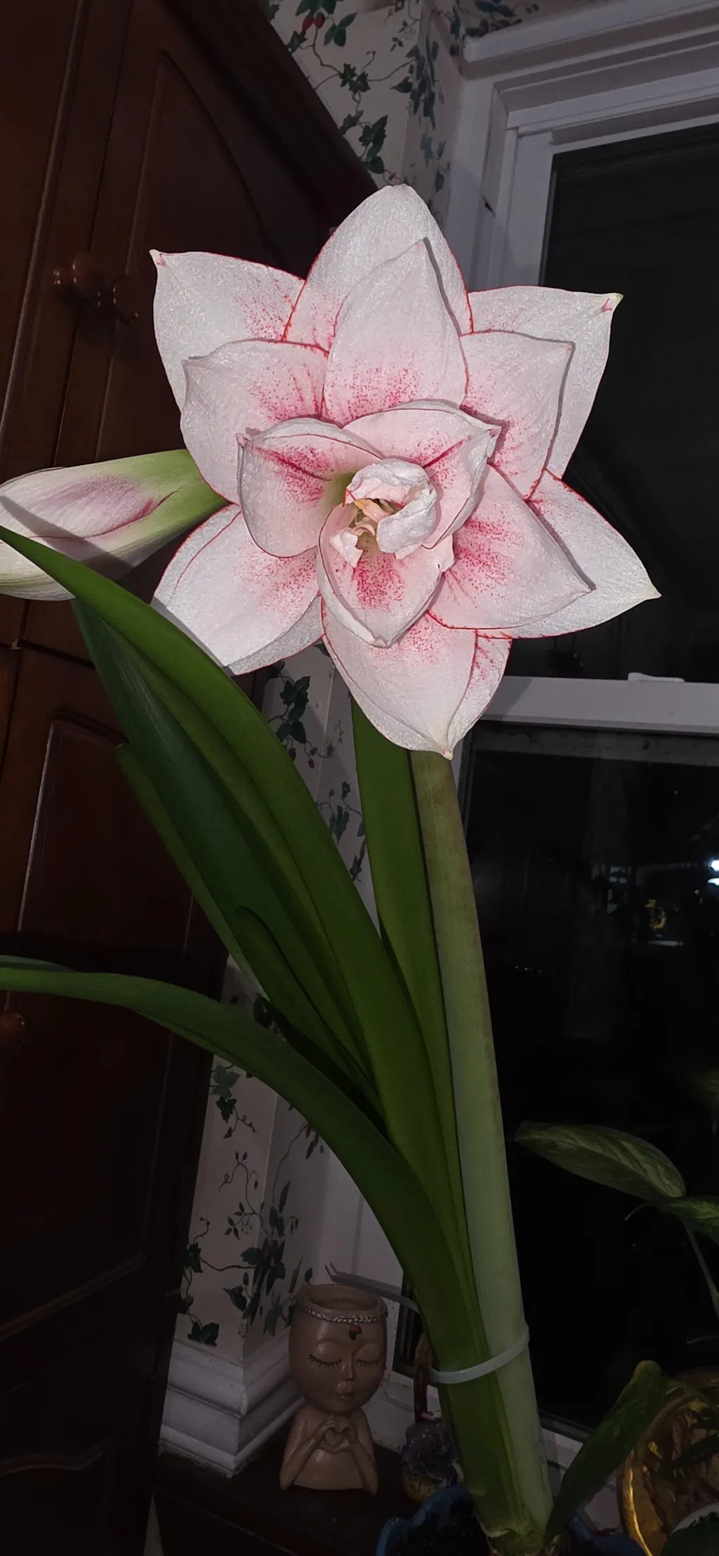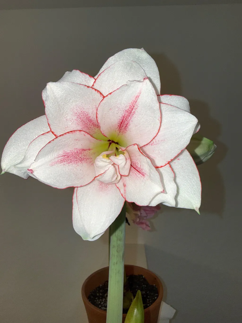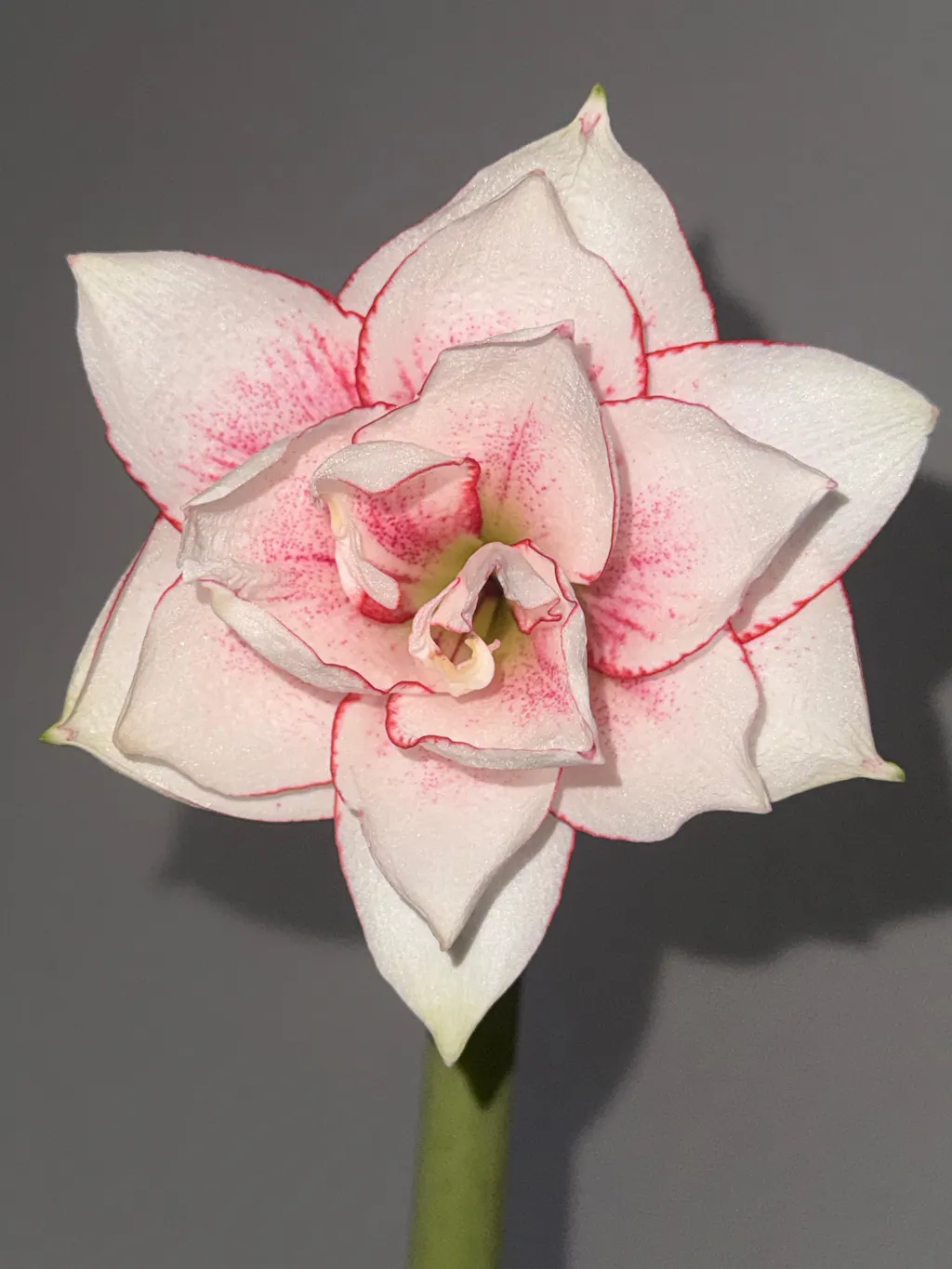 Amaryllis Elvas is a spectacular double amaryllis variety with very full flowers with snowy white petals liberally brushed and feathered by rich raspberry at the throat. Every bloom on the stem is unique with a different pattern of coloring, resulting in a truly sensational display!