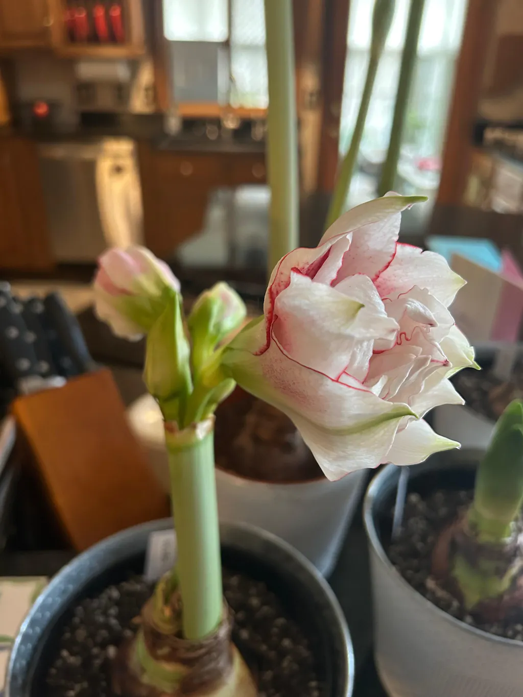 Blooming in exquisite shades of bright red, blushing pink, and pure white, Amaryllis Gervase had us captivated from first glance. The massive, feathered petals are adorned with glistening highlights and striking red anthers that look magnificent perched atop tall, strong stems.