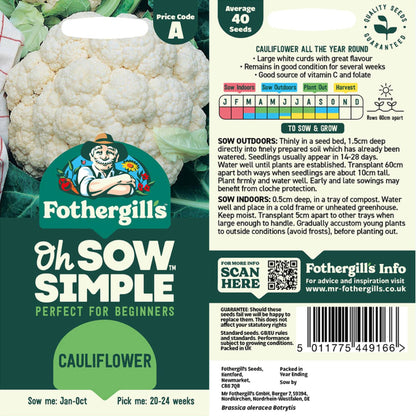 Grow fresh and nutritious cauliflower all year round with Fothergill's Oh Sow Simple seeds from Easy to Grow. Whether you're a beginner or seasoned gardener, this traditional variety is easy to sow directly in your garden or start indoors. A gardeners' favorite for many years! Harvest from June to October for a tasty addition to any meal.