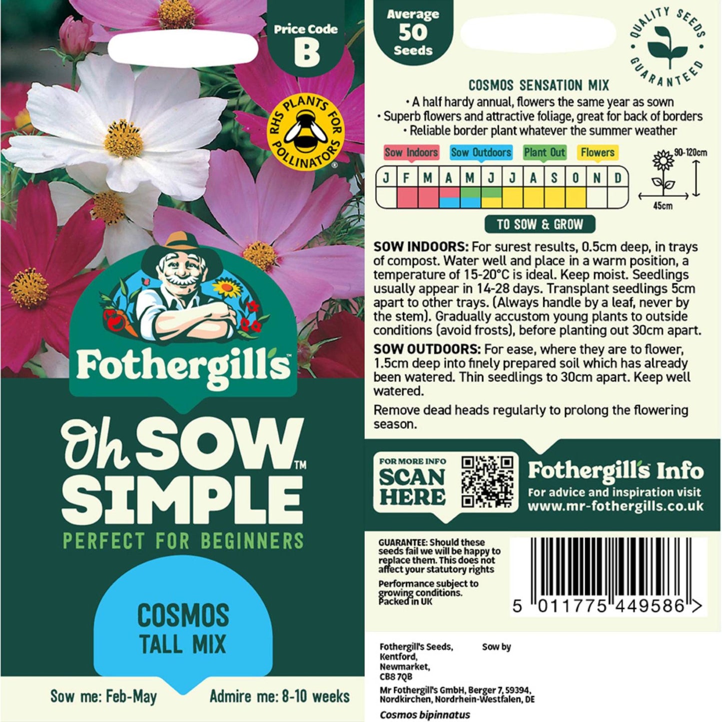 Cosmos Tall Mix seed boasts extra-large single heads and lovely, delicate ferny foliage. Perfect for borders and cut flower arrangements, plant in April and May for stunning blooms from June to October. This half hardy Annual is a must-have for any garden and is now available from Easy to Grow, Fothergill's Oh Sow Simple seed program!
