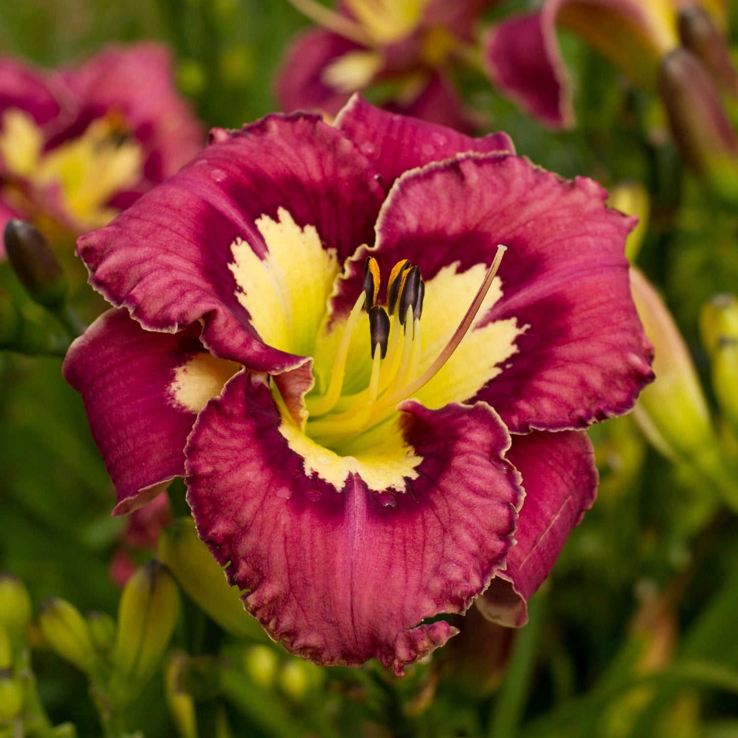 Bring dramatic flair to your garden with Daylily Catcher in the Eye. Its striking blossoms feature a creamy-yellow throat, a rich deep purple eye, and maroon-purple petals, creating a vivid display of color. This reblooming variety offers waves of flowers throughout the season, starting in early to mid summer!
