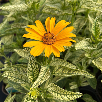 Add a burst of sunshine to your garden with Heliopsis Sunstruck, a compact perennial featuring vibrant golden-yellow daisy-like blooms atop variegated foliage. Speaking of its striking variegated foliage, its creamy white leaves with bright green veins and midrib also creates interest even when not in bloom!