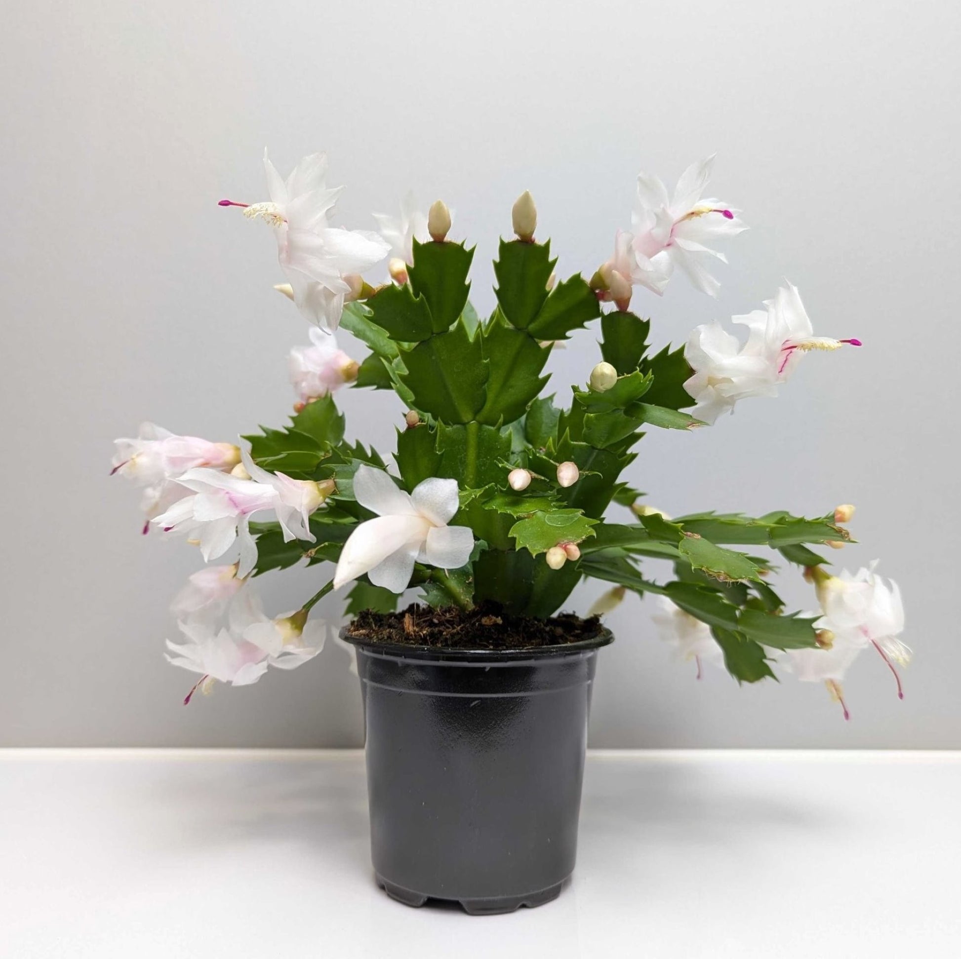 Introducing the stunning Holiday cactus, the perfect addition to your home decor during the festive season! This species has beautiful blooms that come in shades of pink, red, white, yellow or peach and is a true sight to behold when most other plants are dormant. Holiday Cactus 'White' features a clear white bloom with a pink accent that is gorgeous during the winter months. Please note that some blooms may be more pink than others.