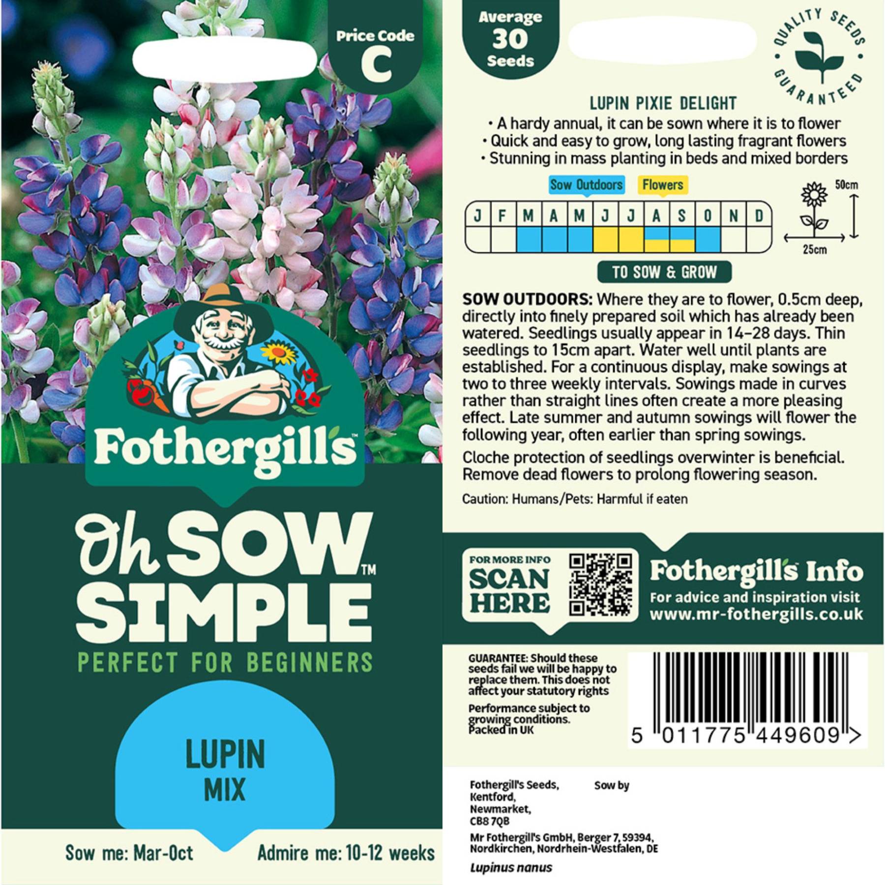 Elevate your garden with our Lupine Mix seed! This vibrant blend of white, pink, and blue flowers creates a stunning visual effect when grown in a group. Standing up to 20 inches tall, these fragrant and bee-attracting plants will enhance any garden. Get yours now from Fothergill's Oh Sow Simple seed program through Easy to Grow today!