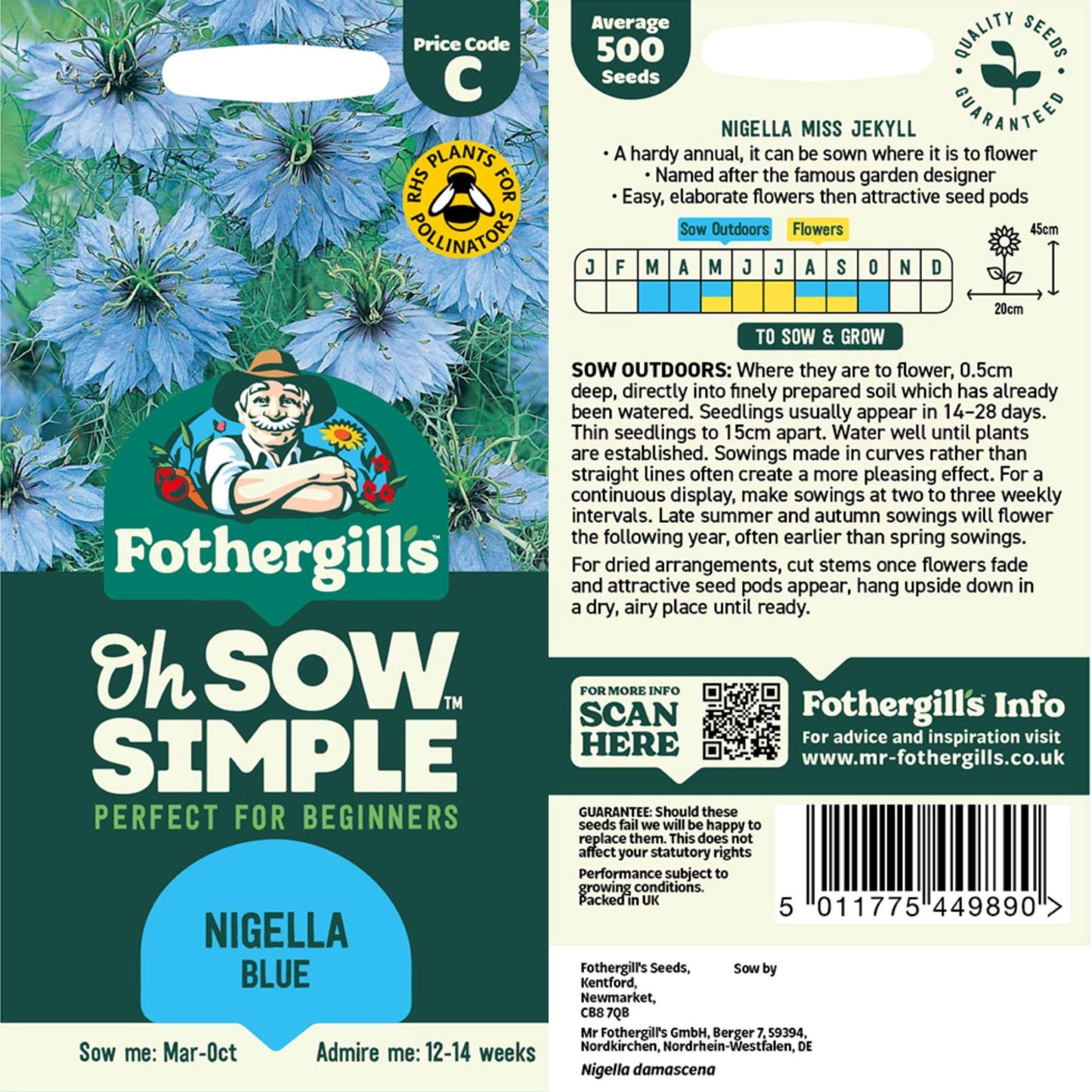 Grow your own Nigella Blue seed and attract pollinators with its delicate flowers that turn into beautiful seed pods. This easy-to-care for plant only needs moderate watering and grows up to 24 inches tall, adding a touch of blue drama to your garden. RHS Plants For Pollinators approved.